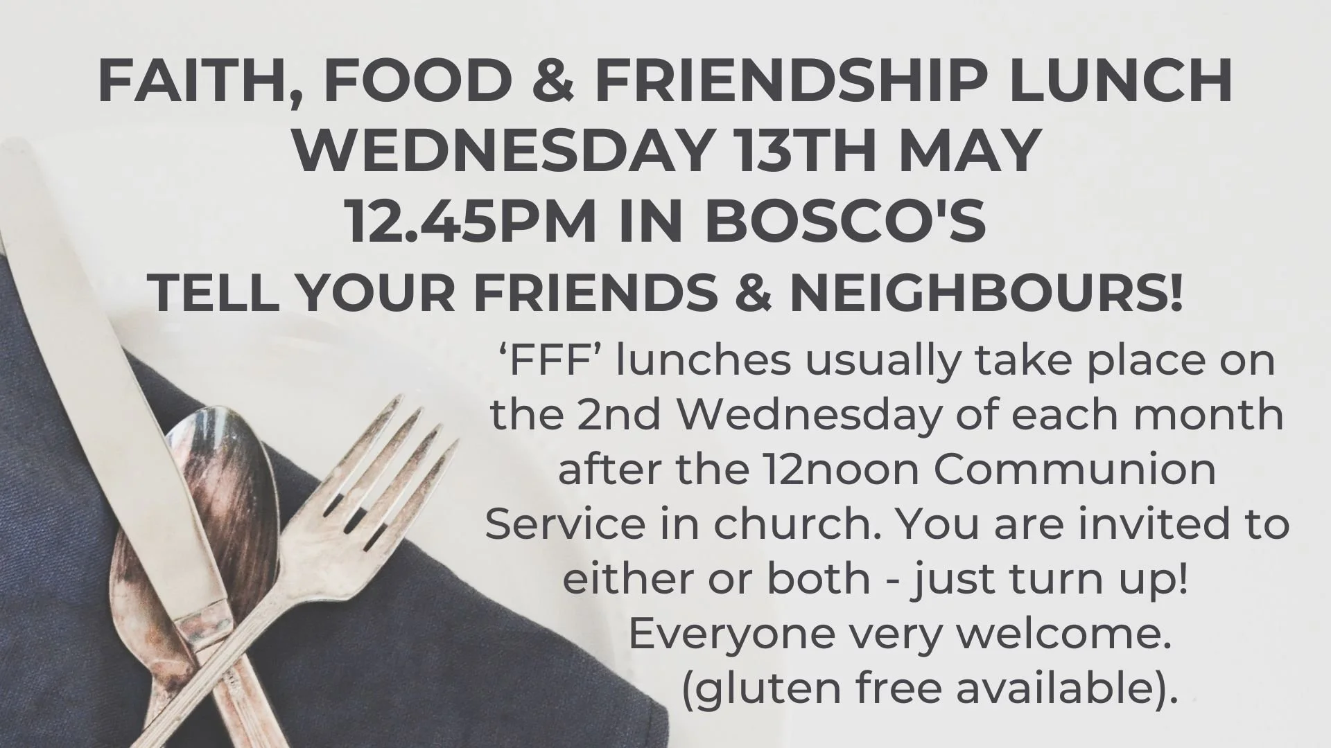 Faith Food and Friendship lunches are usually held on the 2nd Wednesday of each month at 12.45pm (after the 12noon Communion Service). All are welcome to join in with both or either activities. No need to book - just turn up.